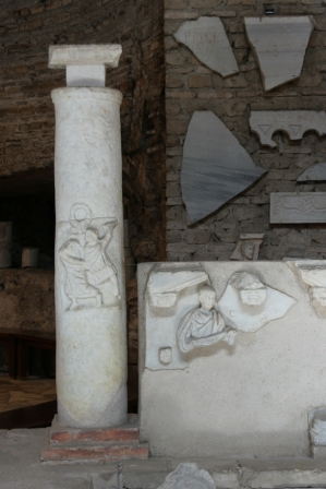 Before going back outside, stop in front of the sarcophagus that stands to the left of the exit stairway. It’s a large pagan sarcophagus in white marble dating back to the 3rd century with comb-like decoration (wavy or S-shaped decorations). At the ends are lions that look like stags. In the 4th century it was reused for a deceased Christian and in the center on the front a small praying figure was carved.