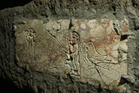 Along the walls of the basilica and of the galleries in the catacombs there are numerous symbols. Carved onto the walls of the tombs, on the marble coverings or the lime that sealed them - they all refer to the faith of the deceased.