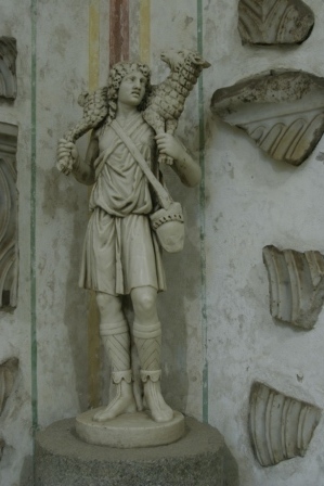 Beneath the arch in front of the exit stairway, on the right hand-rail there’s a fragment of a saprcophagus depicting the figure of the Madonna with the Child Jesus in her arms and the Three Kings kneeling before her - and to the right, the miracle of Moses the spring of water.